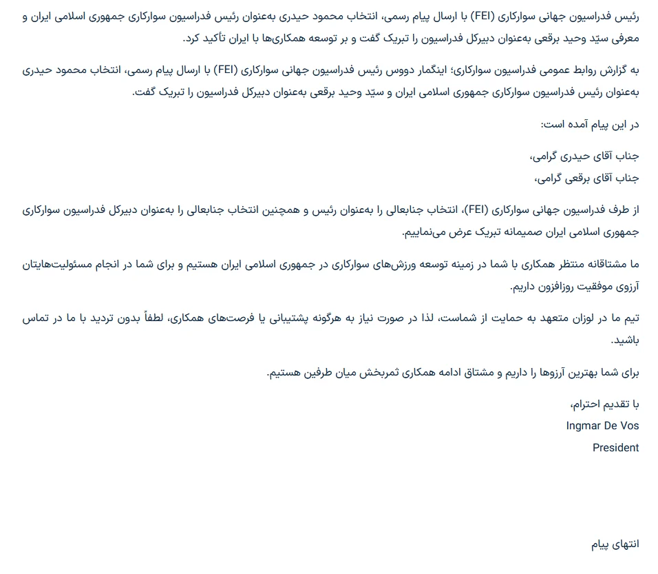 تبریک رئیس فدراسیون جهانی سوارکاری به آقایان حیدری و برقعی