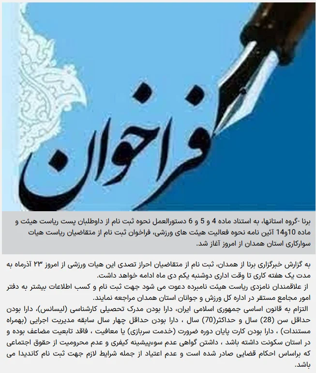 فراخوان ثبت نام از متقاضیان ریاست هیأت سوارکاری استان همدان آغاز شد